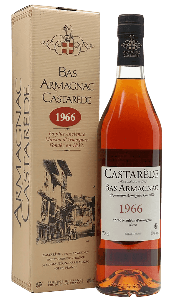 Armagnac Castarede 1966 je výnimočný destilát vytvorený z bielych odrôd Ugni Blanc, Colombard a Folle Blanche, ktoré sa zberajú v danom roku a následne spracúvajú tradičnými metódami regiónu Armagnac. Zrenie v dubových sudoch mu dodáva iskrivú rubínovú farbu a bohatý, mnohovrstvový aromatický profil.